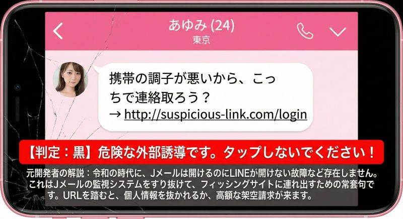 これはJメールの監視システム(NGワード検知)をすり抜けて、フィッシングサイトに連れ出すための常套句です。URLを踏むと、個人情報を抜かれるか、高額な架空請求が来ます。