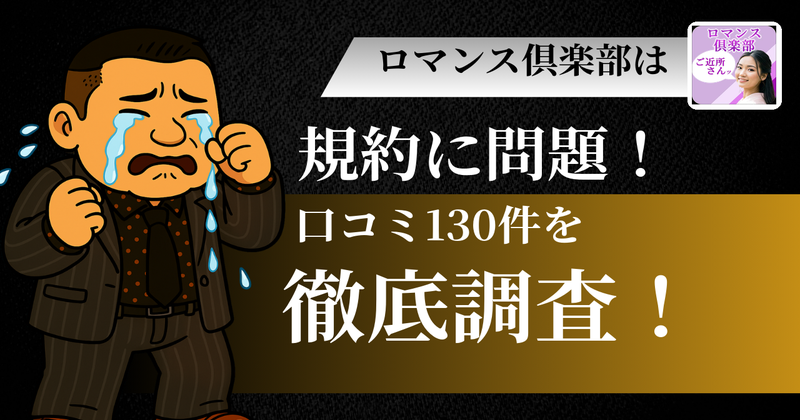 ロマンス倶楽部の評判って実際どうなん?公式の評価は★4.4やけど、「サクラ多い」「出会えない」って声もあって、正直どっち信じたらええか迷うやろ🤔 ワシが130件のレビューと利用規約を隅々まで調べてみたら、「うーん、これはどうなん?」って箇所がち... -