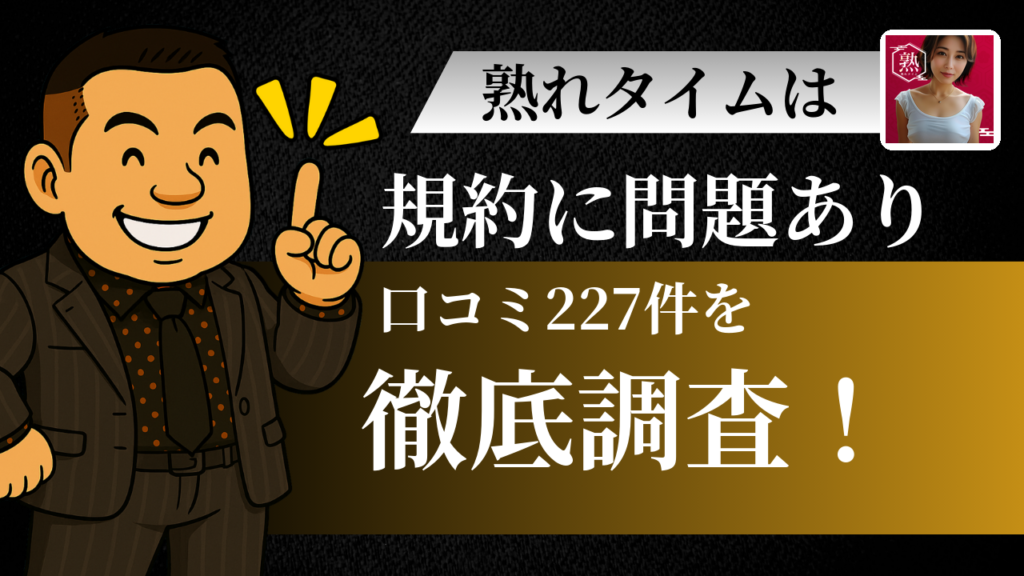 熟れタイムって実際どうなん?「熟年向けやから安心」って思って調べ始めたら、サクラ多いとか規約がヤバいとか出てきて不安になってへん?🤔 ワシが227件のレビューと利用規約をじっくり分析してみたら、「ちょっと待てよ」と思う箇所がいくつか見えてき... -
